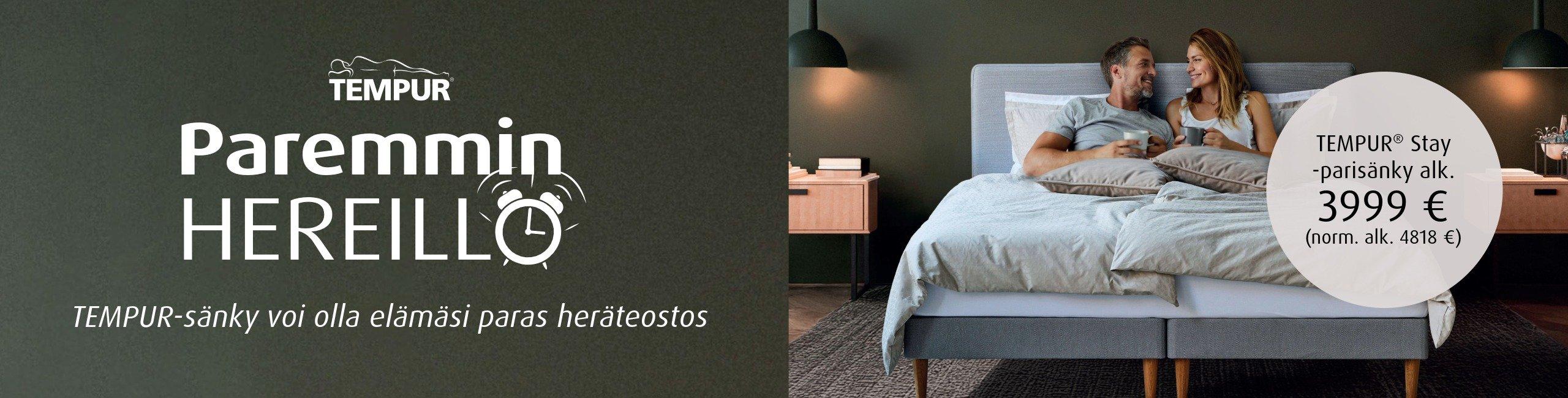 Tältä sivulta löydät vaihtuvat TEMPUR-kampanjat ja alennukset sekä tarjous- ja poistomyynnit. TEMPUR®-sängyt, -patjat ja -tyynyt ovat ergonomisen muotoilun ja uniteknologian edelläkävijöitä. Tutustu tarjouksiin ja kampanjoihin ja löydä juuri Sinulle sopivat TEMPUR®-tuotteet! Valtakunnallinen kampanja voimassa 01.10.-30.11.2025. Kampanjatuotteita ei voi yhdistää muihin tarjouksiin.